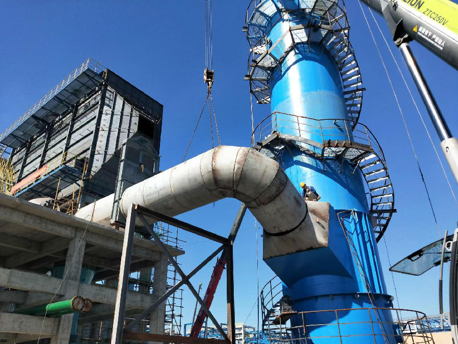 廢氣廢液進入焚燒鍋爐燃燒后,煙氣經除塵后由引風機送氣新增設的脫酸系統中,經過一系列措施實現煙氣中SO2及顆粒物排放達到環保排放要求。脫酸塔設計煙塔一體式,減少了占地面積。同時為了去除煙氣中的二噁英,脫酸煙氣系統設計在引風機出口后至脫酸塔的直管段上安裝吸附床,吸附煙氣中的二噁英,直管段增設旁路,便于檢修。